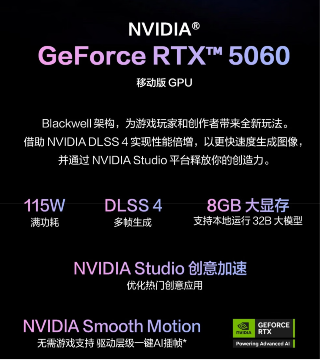 这款迷你主机的显卡配置为移动版RTX 5060,其CUDA核心数量达3328个,显存规格为8GB GDDR7,性能释放功率最高可达115W。该显卡支持DLSS 4技术与光线追踪功能,可确保在2K分辨率下,《赛博朋克2077》《黑神话:悟空》等3A级别游戏能够流畅运行。