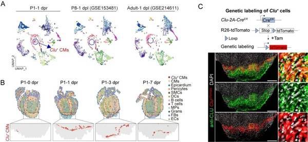 研究团队借助单细胞测序等技术手段,在新生小鼠受损的心脏组织里,发现了一种具有独特特性的Clu+心肌细胞。这类细胞有几个显著特点:它们只存在于处于新生阶段且心脏受到损伤的小鼠体内,并且会大量聚集在心脏伤口的边缘区域,其主要功能就是专门负责心脏组织的修复工作。