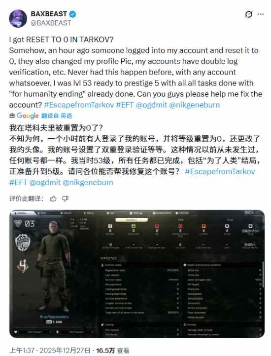 在《逃离塔科夫》的社交媒体话题标签及相关论坛里,有大量玩家反馈自己的账号存档被清空,而主播群体在这次事件中受到的影响尤为严重。