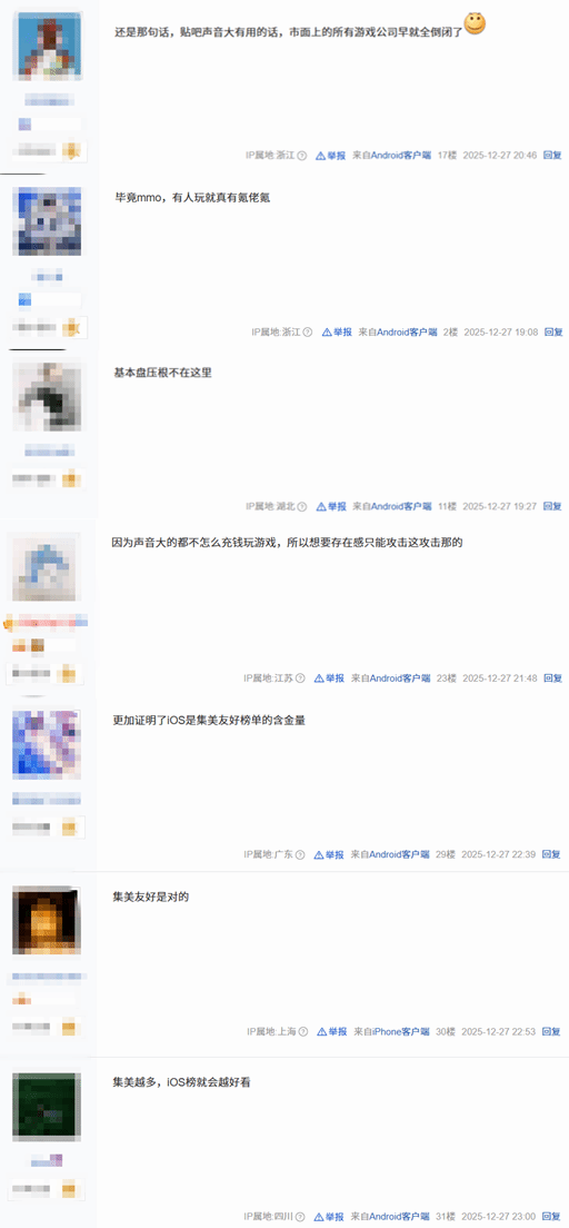 玩家们这样说:“说到底是MMO嘛,只要有人玩,就肯定会有氪金大佬砸钱”“核心用户群体根本就不在这个圈子里”“那些叫唤得最凶的,大多都不怎么在游戏里花钱,所以想刷存在感就只能到处攻击这个攻击那个”“女玩家越多,iOS榜单的排名自然就会更亮眼”之类的。