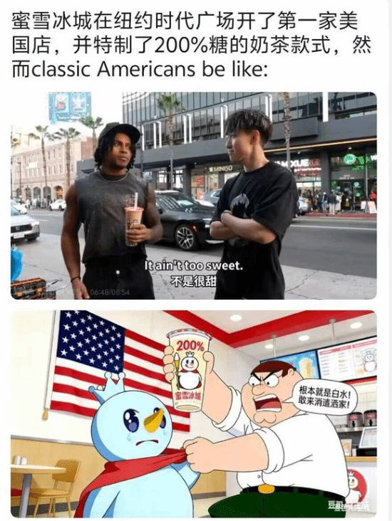 然而令人意外的是,在美国推出200%糖度的饮品后,蜜雪冰城竟被部分消费者吐槽“不够甜”!如此看来,雪王显然还是低估了美国人对甜度的耐受极限。