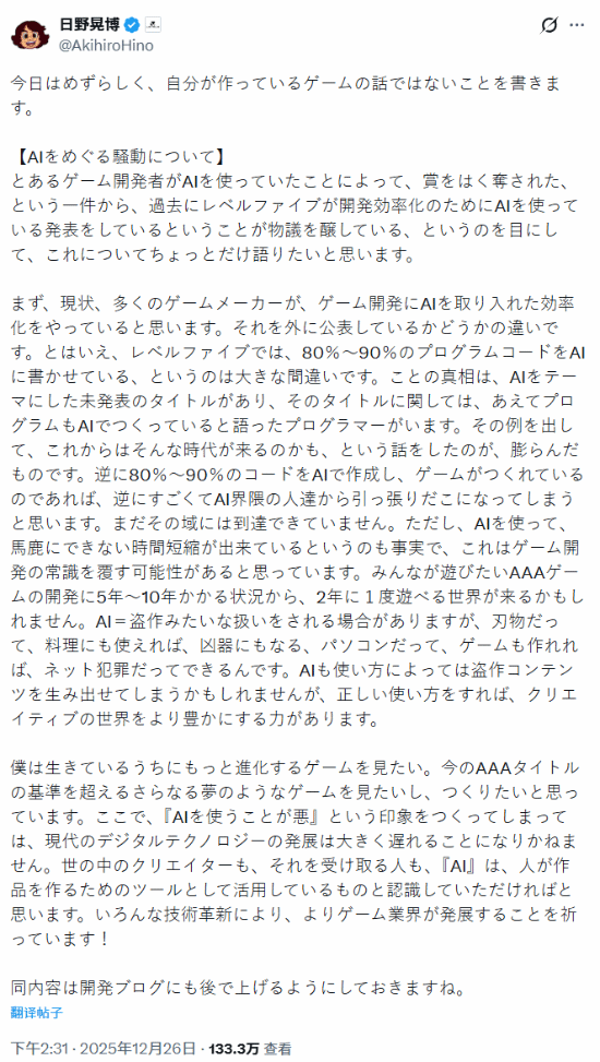 今日,Level-5社长日野晃博特意撰文就此事作出正面回应,揭示了AI在游戏开发领域的实际定位。