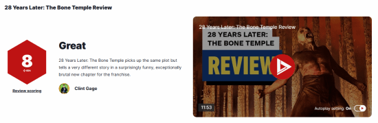 《惊变28年:白骨圣殿》获得了8分的高分评价。作为去年《惊变28年》的续作,导演尼娅・达科斯塔交出了一份亮眼的答卷——既有震撼的大场面,又不乏深刻的思想内核。影片中巧妙融入的机智与幽默,精准地增强了这个历经近三十年的丧尸末日题材的戏剧张力,而拉尔夫・费因斯演绎的唱片收藏相关情节,更是成为了全片的点睛之笔。