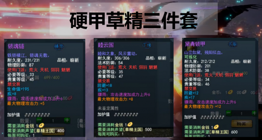 硬甲门派的“草精三件套”属性如上,累计附加38点疾、25点最大物理攻击和38点骤雨。