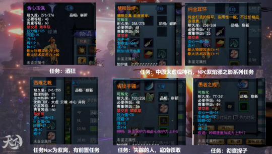 拿到武器后,就能依据自己的装备状况去做支线任务获取装备了。一般来说,拿到推荐装备后,大家差不多就能轻松下副本了。还有,到了59级阶段,系统基本不会再产出特别合适的任务装备,建议大家直接用手工套装和副本套装混搭的配装思路,缺的部分根据属性搭配几件55级的任务装备就可以了。