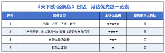 由于大家前期日钻、月钻比较紧缺。因此,建议大家按照下表的原则的优先上钻。