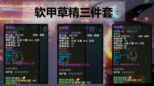 软甲门派的“草精三件套”属性如上,累计附加38点魂、22点念和18点疾语。