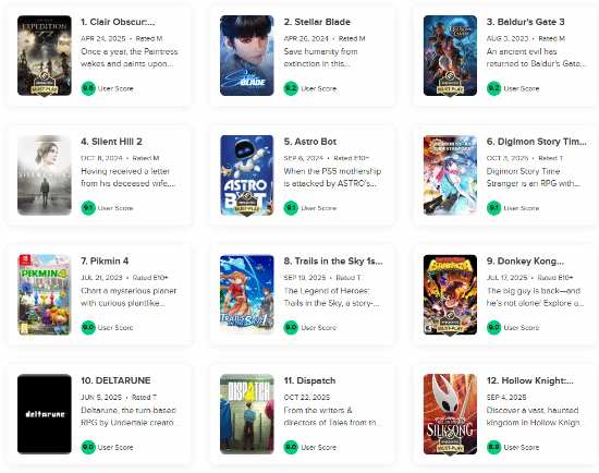 截至目前,这款作品在MC平台的用户评分(User Score,完全由玩家打分构成)已达到9.6分,在该平台历史评分排名中位居榜首——其时间统计范围虽涵盖1958年至2026年,但平台实际收录的首款电子游戏始于1980年;同时,它也是近年来少有的能在海量用户评分基础上仍保持如此高水准的作品之一。