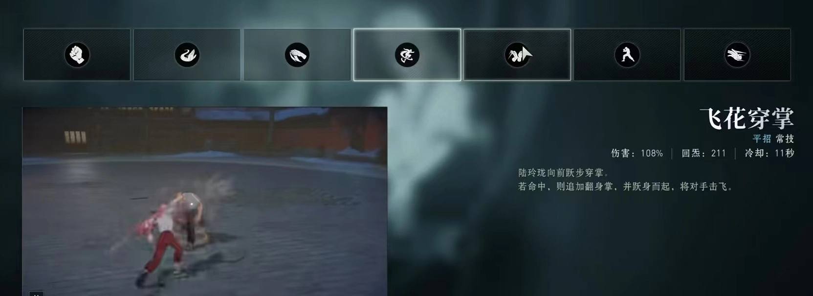 最后一个平招技能飞花穿掌,能让角色向前跳跃,命中敌人后可反身击飞对手。使用绝技时,角色会向前走去,直接突袭对手,接着发起一段连续的长辫攻击,最终将对手击飞。这个角色的反击效果和防御能力都十分出色。若想顺利掌握技能操作,还需结合场景灵活运用。