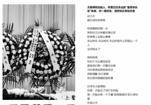 在陈伟的追悼会现场,马云夫妇敬献了花圈,挽联上写着:“爱得真诚,获一世的情谊;活得洒脱,享有趣的灵魂。”