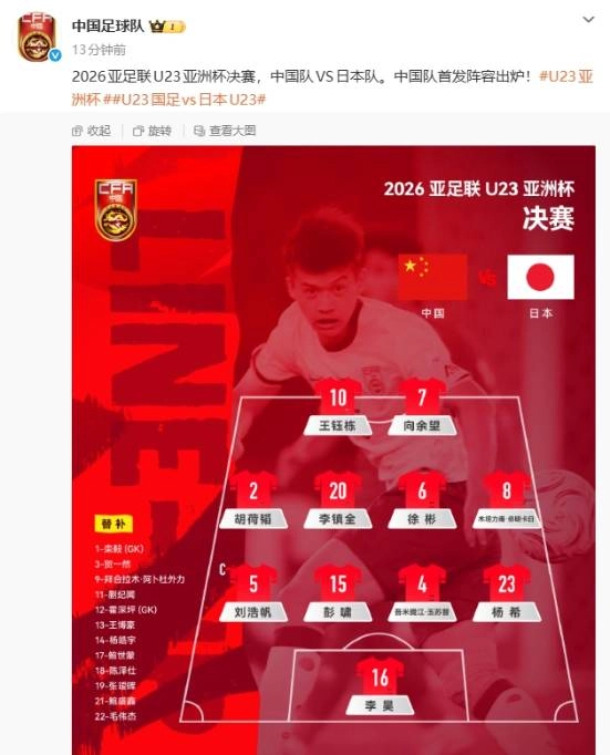 而在今晚23点,中国男足即将在决赛中对阵日本队,全力冲击中国足球史上首座U23亚洲杯冠军奖杯!