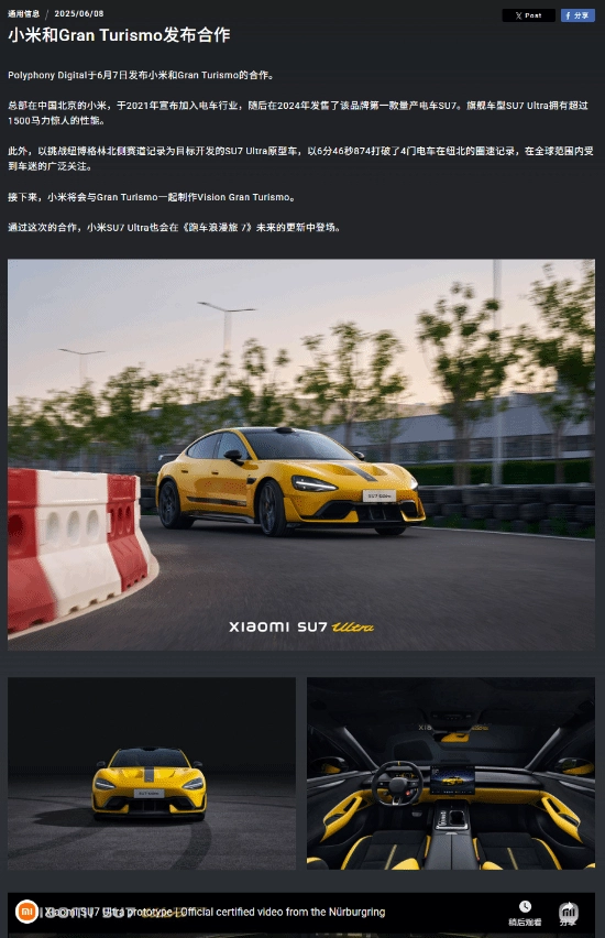 听起来或许有些难以置信,但事实上早在去年6月,这款游戏的开发工作室就发布过一则公告,宣布《GT7》将与小米展开合作,并明确提及未来会在游戏里推出小米SU7 Ultra。