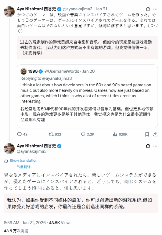 曾参与《真女神转生》《女神异闻录》等经典游戏系列创作的西谷史(Nishitani Aya),近日在个人推特上分享了对当代游戏开发的见解。他提出,要推动游戏不断进化并创造全新玩法,开发者需跳出游戏领域的局限,从电影、音乐、文学等其他领域汲取灵感,而非仅仅参考借鉴其他游戏作品。