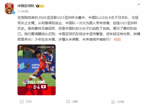 在2026亚足联U23亚洲杯决赛落幕之后,中国足球队官方发布消息,对队伍在赛事中的表现予以了肯定。官方声明中提到:在这场刚刚结束的决赛里,中国队以0比4的比分不敌日本队,未能捧起冠军奖杯。