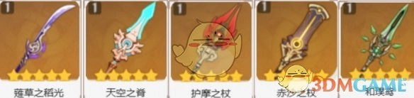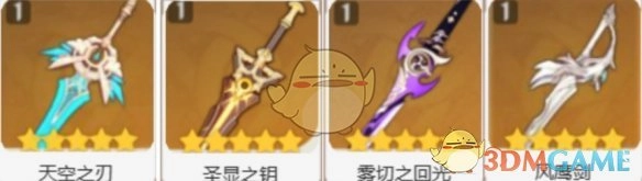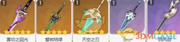 - **充能**:天空之刃、原木刀、西风剑、飞天御剑(此飞天御剑仅适用于前期尚无四星充能武器的阶段)