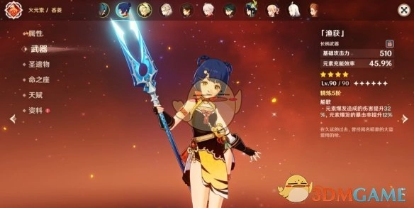 充能武器选择:薙草之稻光、天空之脊、西风长枪、渔获、且往亭御咄。