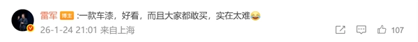 雷军在评论区还表示:“要做出一款既好看、又能让大家都放心购买的车漆,确实不是件容易的事。”