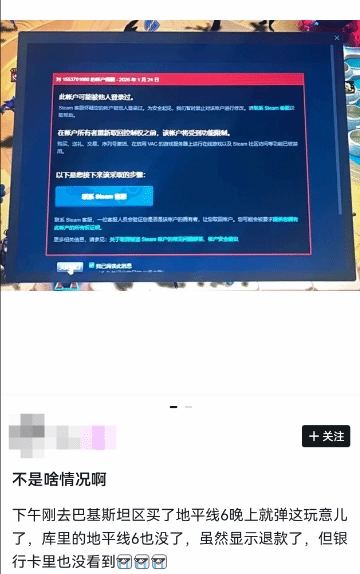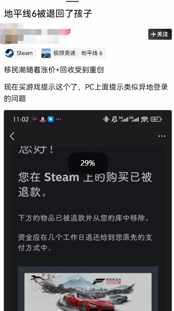 随后,Steam对巴基斯坦区的游戏售价进行了上调,其中标准版价格从38.99美元调整至48.99美元,同时针对部分订单开启了回溯处理流程。根据多位受此影响的玩家反映,他们此前在巴基斯坦区购买的《极限竞速:地平线6》订单已被系统自动强制退款,游戏也从个人库中被直接移除。还有部分玩家收到了Steam发出的“红信”警告,账号被标注为“存在安全风险”,更有甚者遭遇了临时限制登录的情形,系统提示显示“此账户可能被他人篡改”。