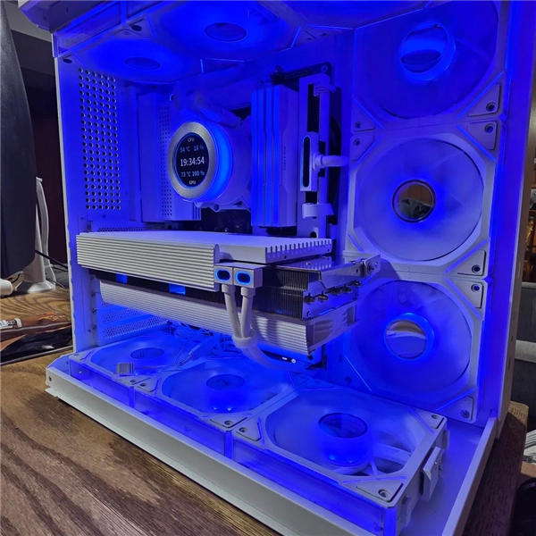 除了换上大型的新散热器,他还利用铝废料打造了前面板与下部风扇护罩,并且把原装风扇替换成了三颗92毫米的利民RGB风扇。