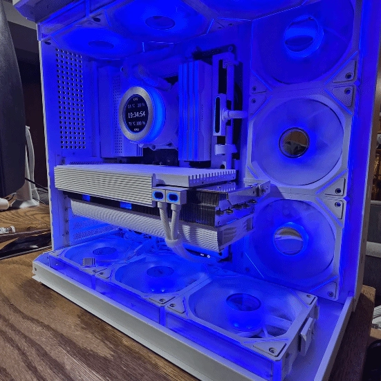 除了换上尺寸更大的新型散热器,他还利用铝制废料打造了前面板与下部风扇护罩,并且把原本的风扇替换成了三个92毫米规格的利民RGB风扇。