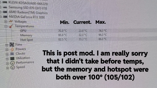 经过改装,显卡的GPU温度有了明显下降,热点温度至少降低了20°C。不过,额外加装的铝材重量很大,为了避免压坏主板的PCIe插槽,玩家专门加了一个90度的钢制支架来加固。