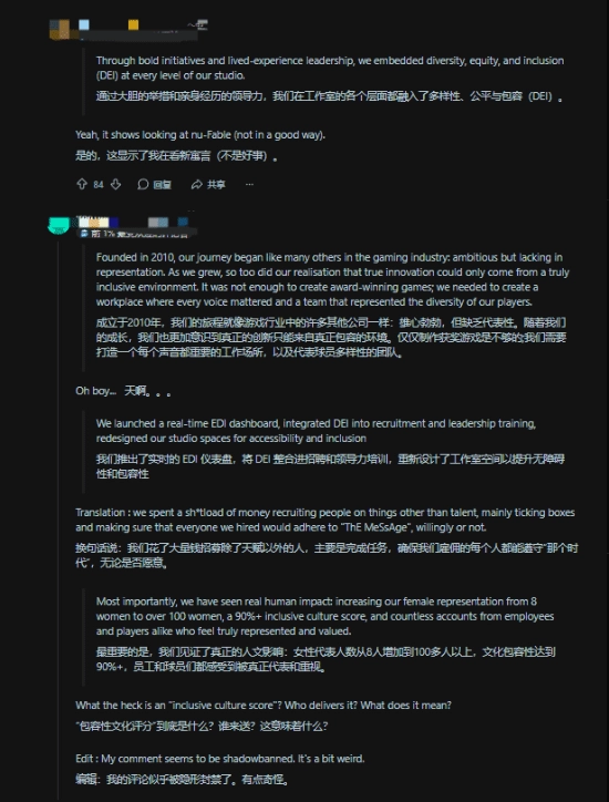 近期矛盾再次激化的导火索是,reddit玩家发现该工作室在Inclusive Awards(包容性奖项)平台的资料里,大张旗鼓地宣传自己正大力推行DEI(多元化、公平与包容)政策——比如将DEI纳入招聘与领导力培训体系、打造具有包容性的“安全空间”等,且已把这些举措渗透到了工作室运营的各个层面。