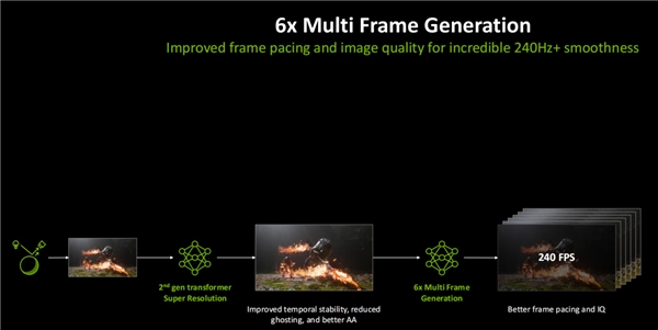 同时,DLSS 4.5搭载了全新的动态多帧生成技术,相较于DLSS 4的4倍多帧生成能力,其最高可支持6倍多帧生成,能够显著提升游戏运行的流畅度;此外,该技术还可根据当前显示器的最高刷新率设置,以刷新率作为帧率输出目标进行实时动态的多帧生成调整,确保最终呈现的帧率与显示器的刷新率设置保持同步。