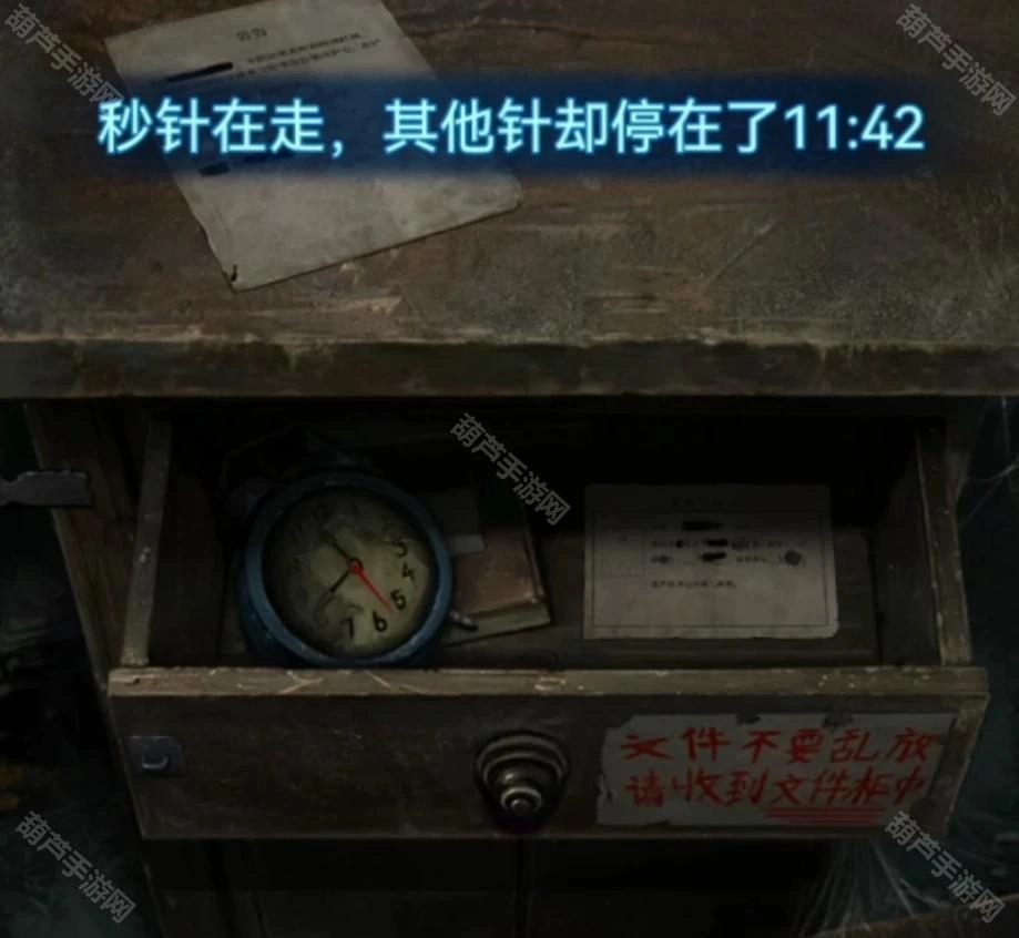 查看一下中间的桌子,上面文件不知道时间先不填,下面的抽屉需要的正是五位数字密码,调整为62464后打开抽屉,右边拿到探视57号的申请表,左边的钟表点一下会提示时间停留在了11:42,那这就是桌子上收表时间咯,对桌子上的公告使用圆珠笔,调整为11:42提示听到脚步声就算是完成了。