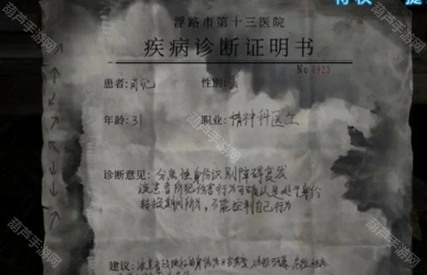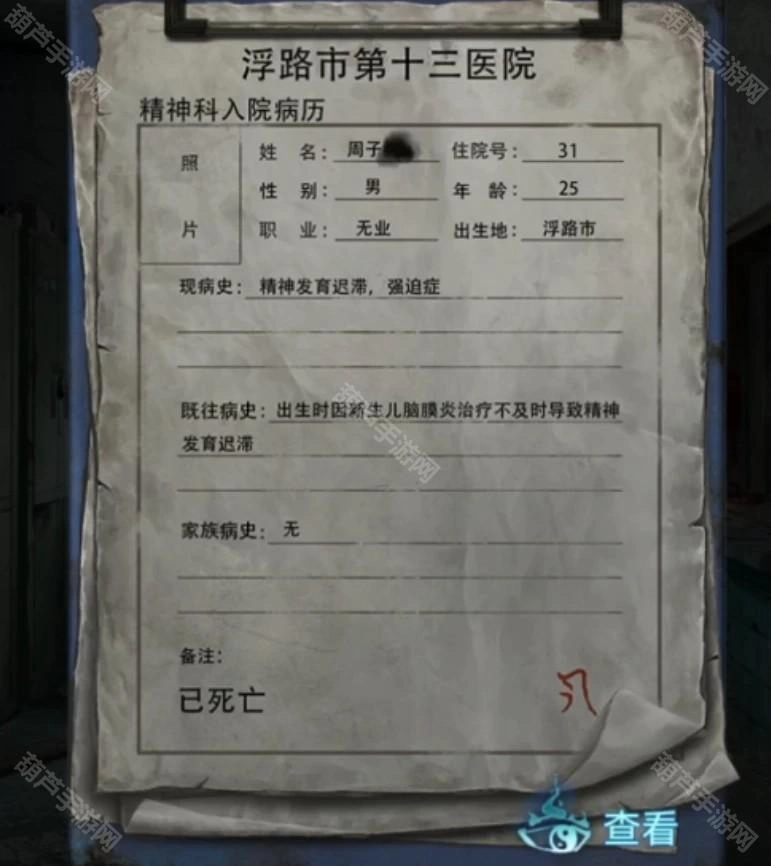 查看下方病例后发现是肖医生的,用肖医生的ID卡在照片位置操作,就能生成探视申请表。回到大厅吧台,把申请表放进左边的纸盒里,就能再次进行探视。返回探视室,查看右侧的玻璃,这里会有小高能提示,按照指引查看他的眼睛,得到的数字就是保险箱密码:顺时针75度、逆时针20度、顺时针60度。按这个顺序转动中间的保险箱,打开后取出六葬菩萨的金像,拿到金像时会有小高能!再次回到走廊,进入左侧房间,将金像也放在镜子前,随着八音盒的声音会出现新NPC。跟随剧情发展,再次来到奘铃村,本章至此结束。
