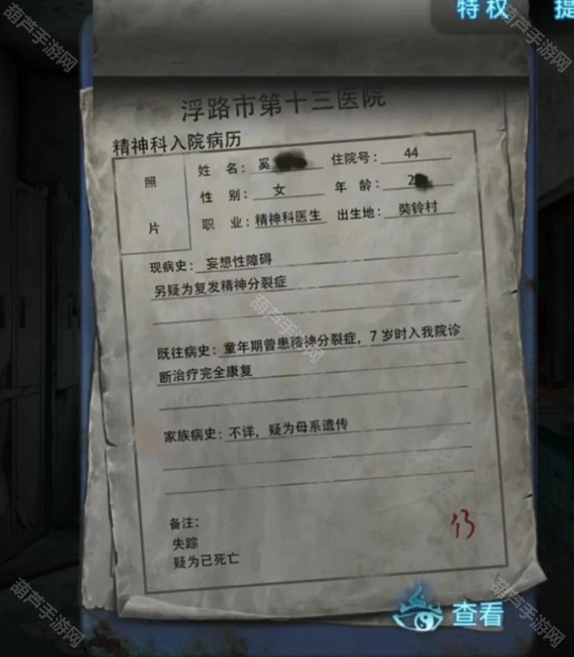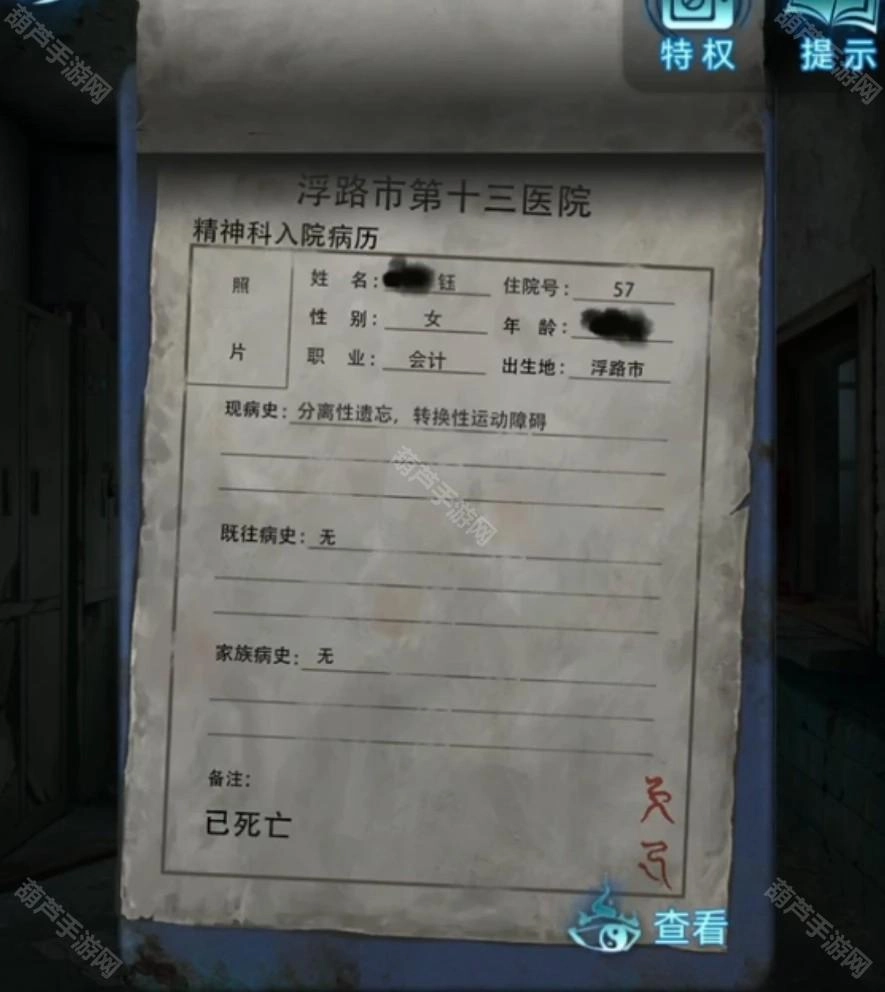 出门去右边的接待室查看柜子,用57号钥匙打开57号柜子拿到57号患者的照片,感觉蛮顺口的呢,来到走廊查看左边的房间,透过窗子能看到一个空相框,那我们就隔窗贴物把57号患者的照片给贴到相框上,有人将窗帘拉上了出现了位置线索,调整好就能开门进入熟悉的房间了。