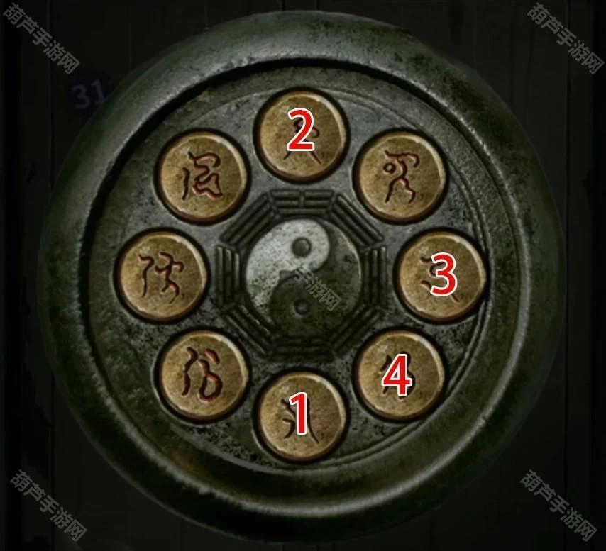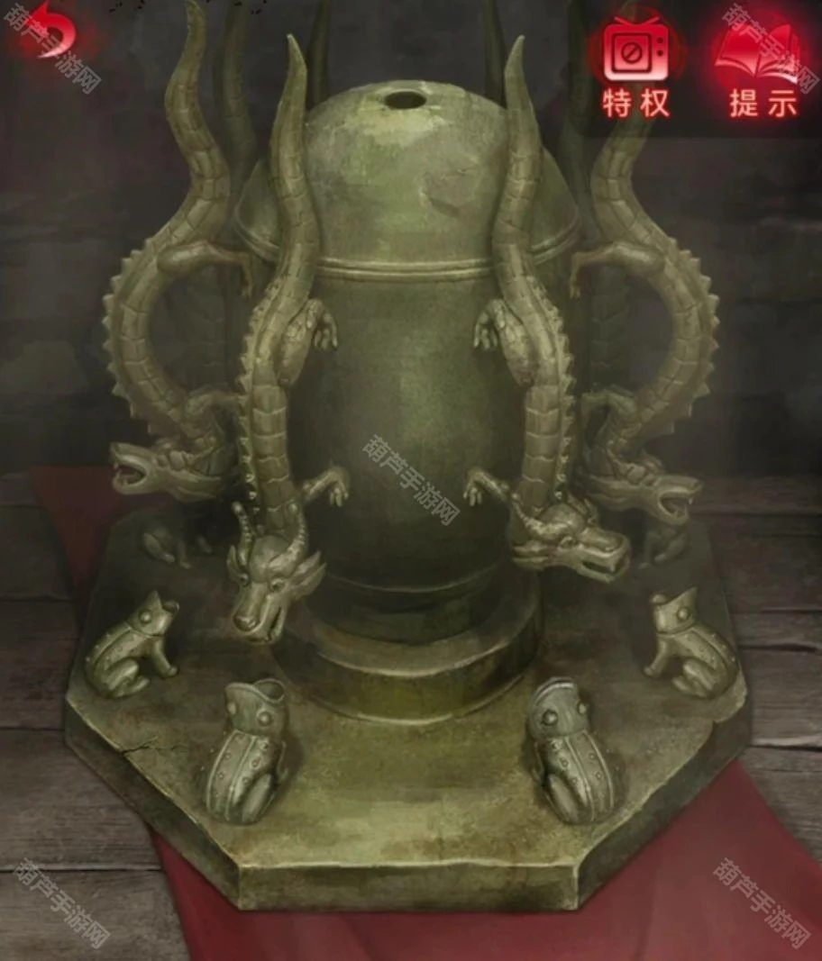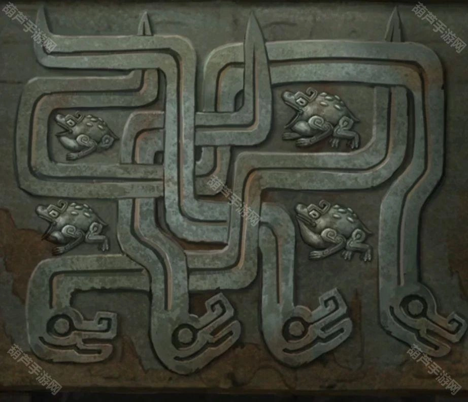 然后可以直接回到迷宫入口再次走迷宫,这次走左上角的木柜子拿到罗汉像,中间偏左上位置还有个东西走过去发现是个地动仪,这里只要走到过一次的位置后面就能直接到达了,所以不用怕需要反复走迷宫,那是某3外传干的事情~再走到右上角位置发现是个青铜鼎,观察一下上面的图案,按照龙尾巴来看龙头的高度是上下上平,四个蛤蟆的嘴左上角小张,右上角和右下角大张,右下角闭嘴,记好了回到入口将罗汉像放入水柱。