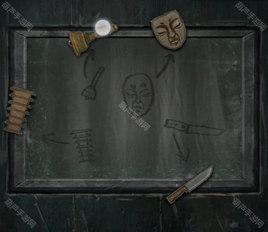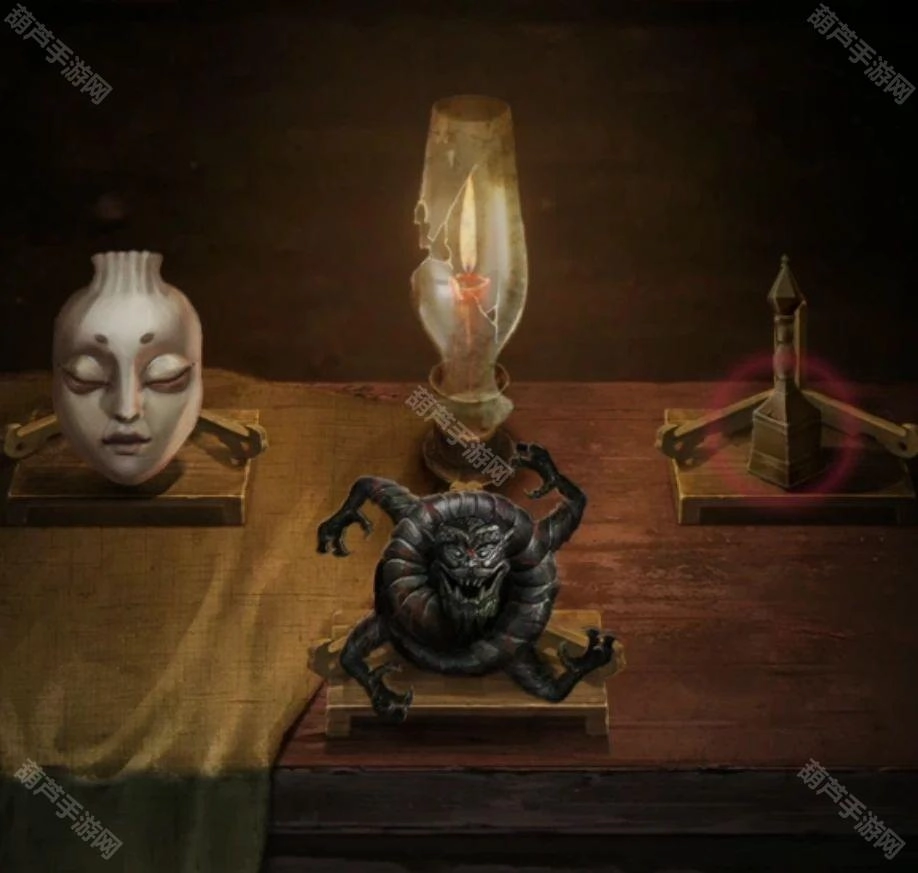 来到密室,中间桌子上有三个空架子,把丑东西、面具、铃铛都放上去后果然开门了,进门本章结束。