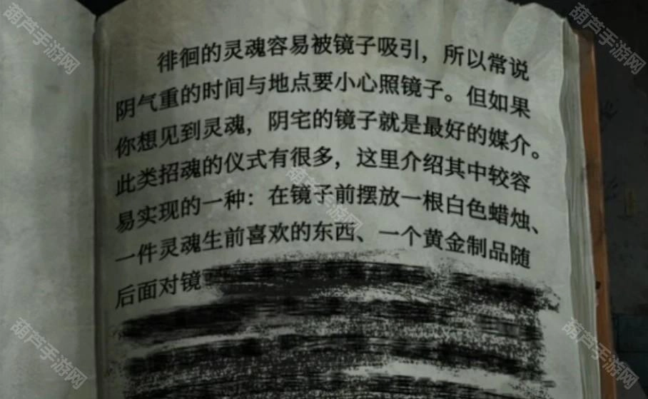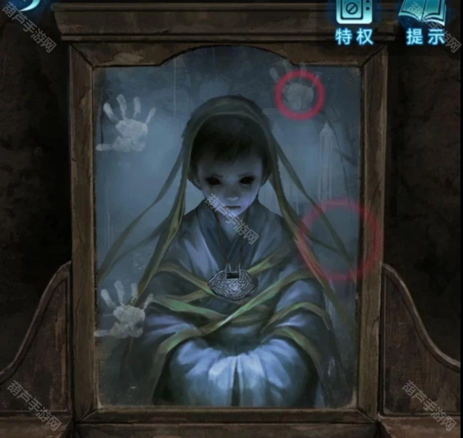 查看右边被木条封住的窗子,上下都是三个钉子,所以刚刚诊断书上的线索右上-上-左下-右上-左上-下-下-右上就是用在这里的了,中间还有个蛋壳纸条提示,按照这个顺序依次点击钉子就会发现窗子被里面伸出的鬼手打开了,通过窗子就能进入屋内,来到屋里先看一下左边的镜子,照出来的竟然是女童,明显镜子上缺了个燕子图案后续注意。