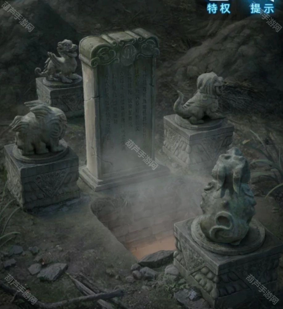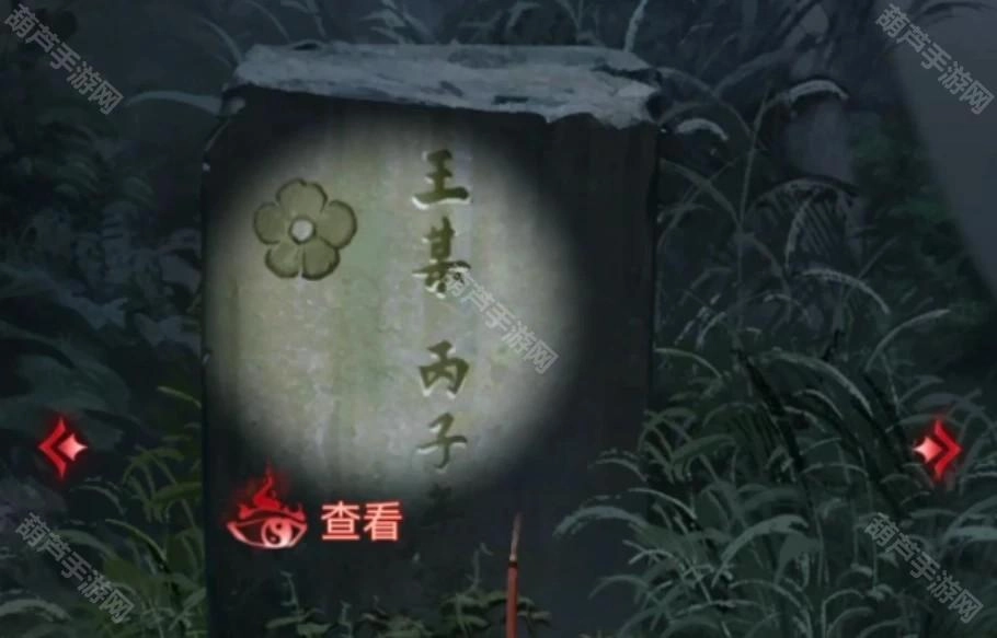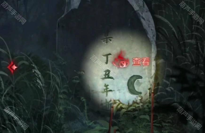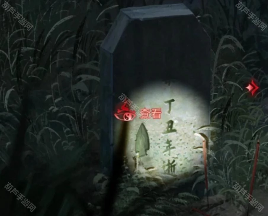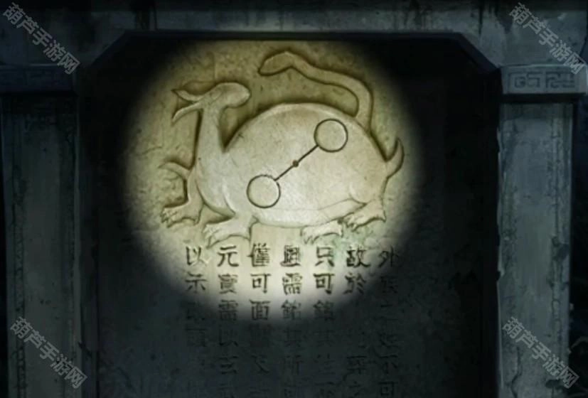 先用手电筒查看一下最左边的墓碑,重点是上面的图案,注意两个圆圈是位于前脚和尾巴位置,后面会用到的,然后就可以查看右边的墓碑了,能看到墓碑上有图案,注意看第四个墓碑时候有个高能,给米雪都吓了一跳,很少见谜题部分有高能啊!真没想到,查看完毕是可以左右转动的,记下来箭头=丁丑,花花=丙子,月亮=丁丑。