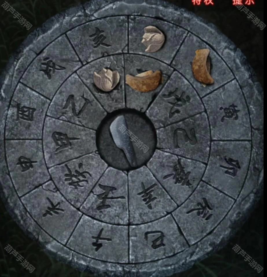 查看右上角位置可以看到两个白幡,提示上面还有个挂钩,后续要找东西来挂上去的,暂时线索不多开始解谜吧,查看左边的石桌,将六个石雕都放在对应的文字上,箭头=丁丑,花花=丙子,月亮=丁丑,因为月亮和箭头都是丁丑所以会有重叠,花花的图案是长春花但是石雕是荷花,都放好后中间暗格打开拿到石刀。