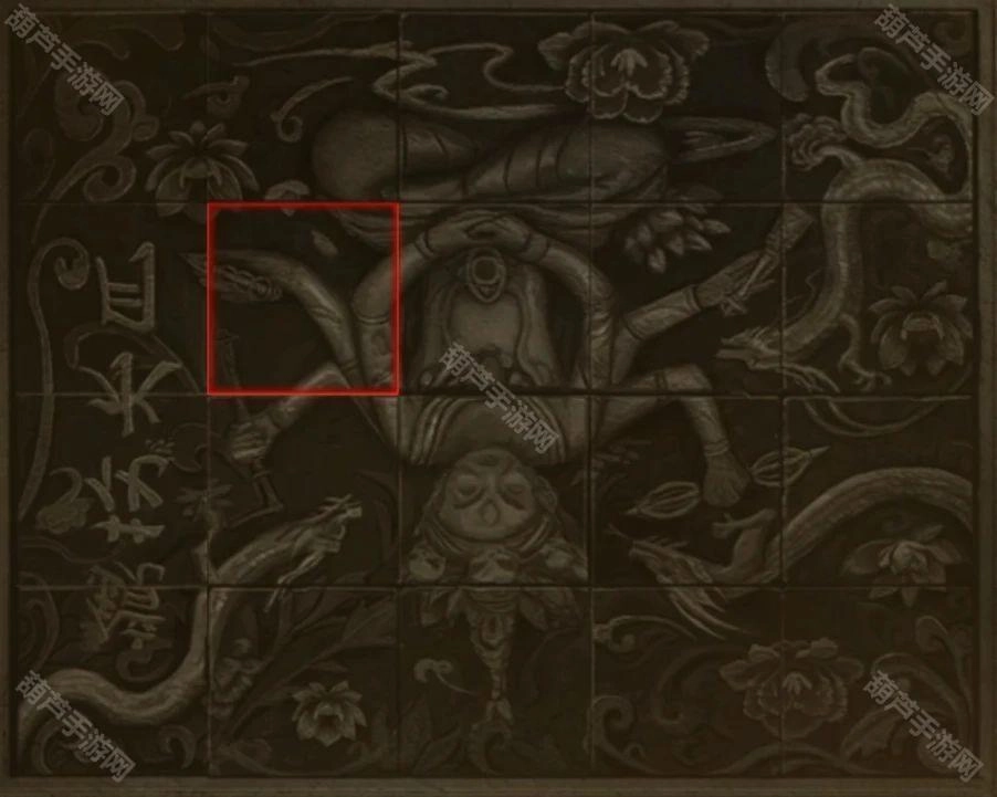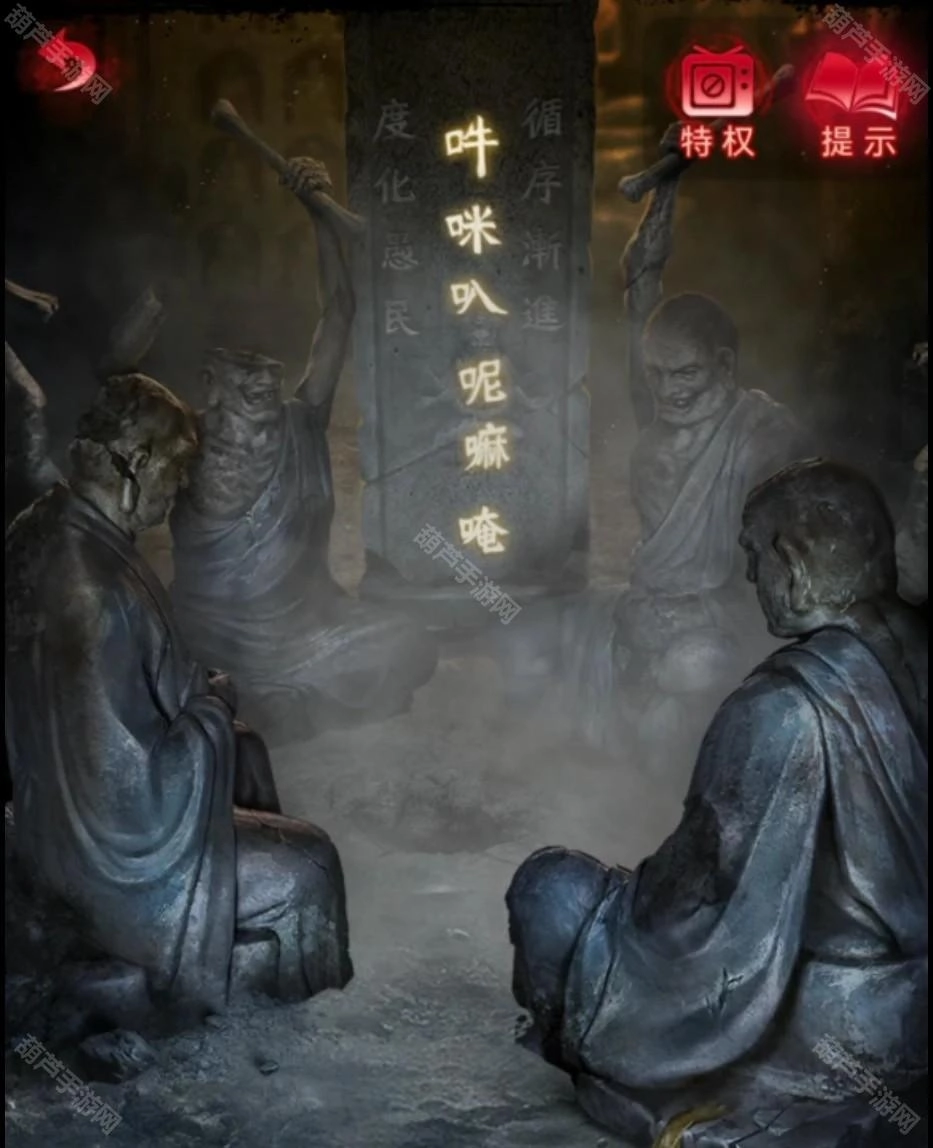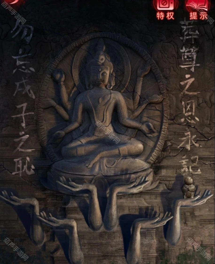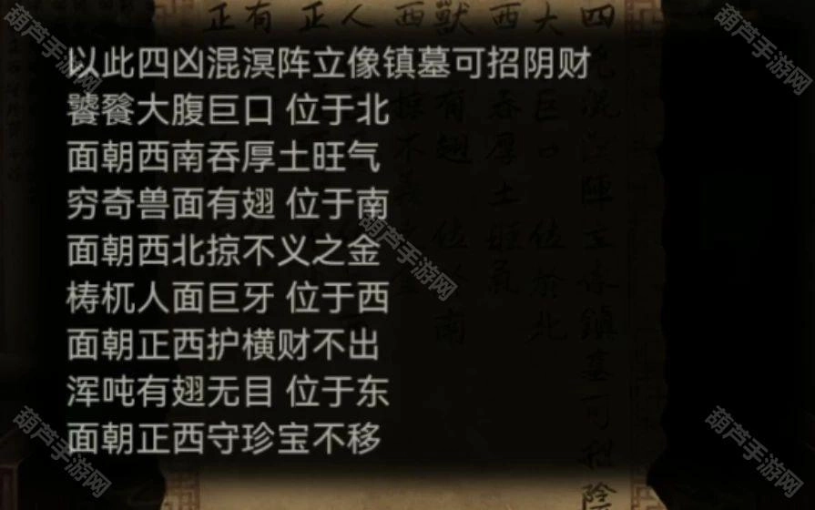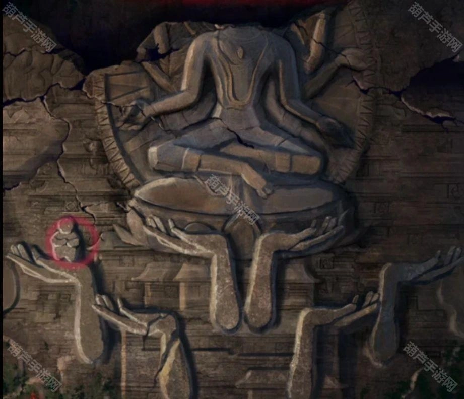切换肖医生拿到罗汉像,来到跪拜间将罗汉像放在右边的空底座上,拿到寺庙金雕和金秤砣,后面的卷轴有四凶混溟阵线索记下来饕餮-大肚子大嘴-坐北朝西南,穷奇-兽面有翅-坐南朝西北,梼杌-人面巨牙-坐西朝西,混沌-有翅无目-坐东朝西,记好就可以后退到石人场景调整左边的石雕组了。