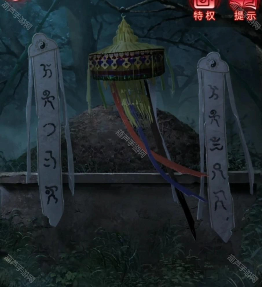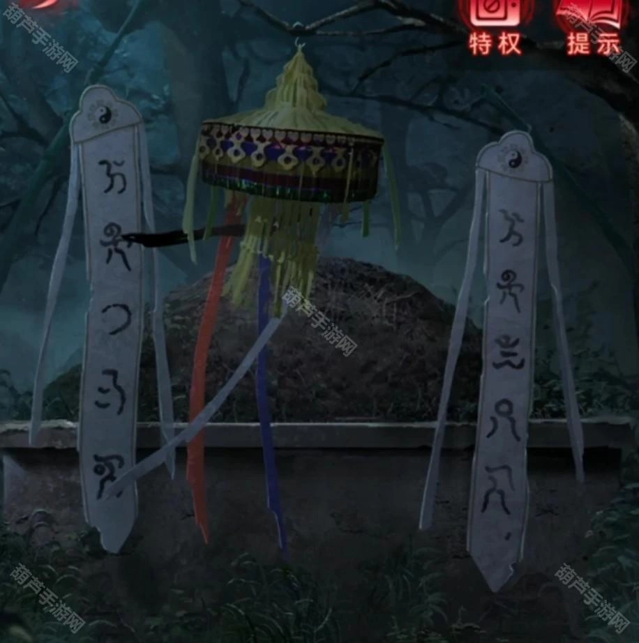 查看左边的水池使用禅杖获得灵幡,注意水池右下角还有个不倒翁别忘了,这个灵幡看起来是需要挂起来的,我们前面在墓地有个钉子,所以回到墓地查看右上角的坟墓,使用灵幡后突然起风了,可以注意到风往左和右会导致灵幡的四根色带飘向不同的鬼画符,都记下来黑色是小人跳舞,白色是无头坤坤拍球,红色是只,蓝色是栏杆上挂了个钟。