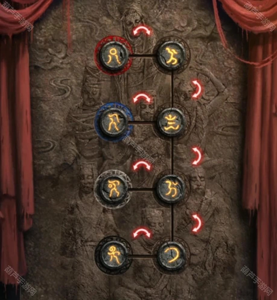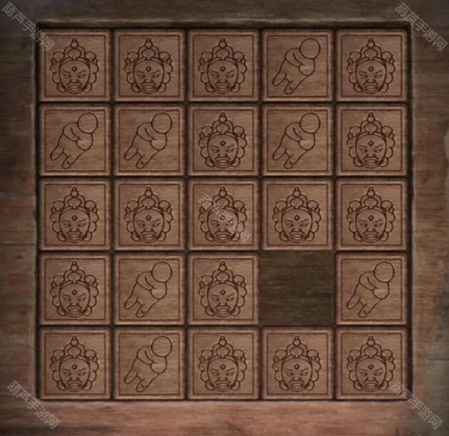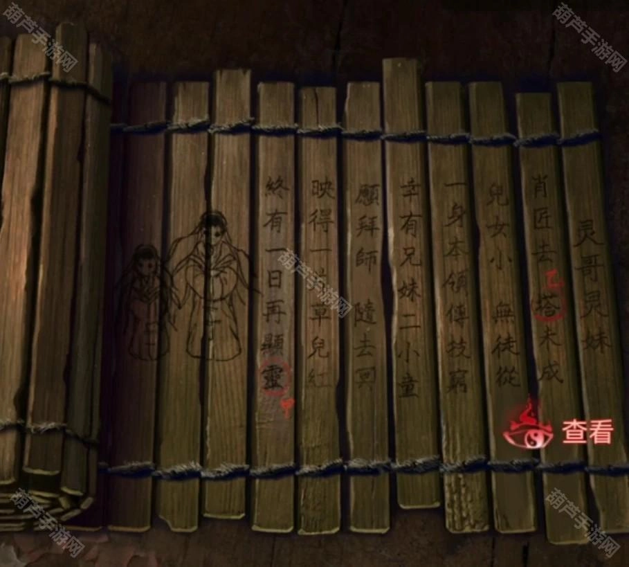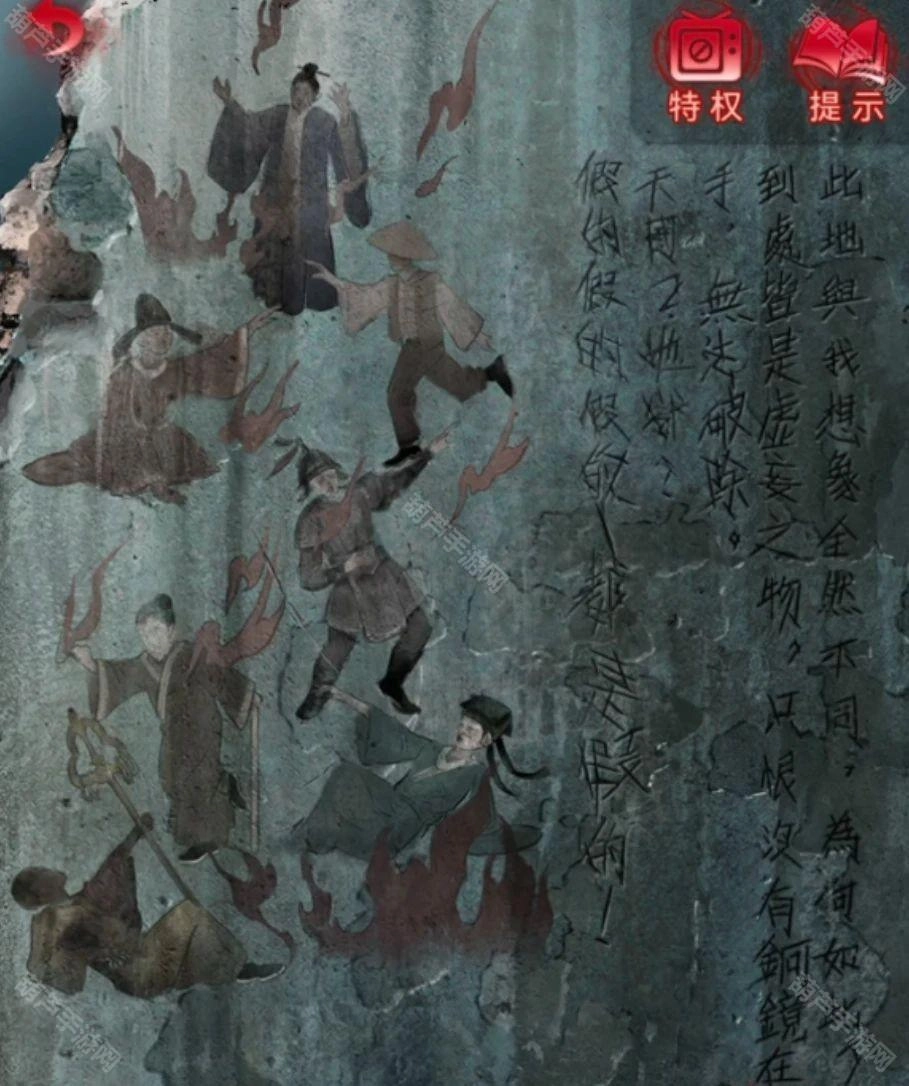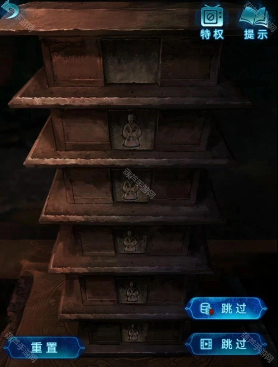 再次回到密室把帛画放在地面的石板上,塔变成了具象化的,需要将所有小人都调整出来,这里从倒数第二个开始往上点就能完美调整了,最下面的是联动最上面,但是最上面的却不联动任何一块,所以最后调整最上面的即可哦~将所有石门都调整为有小人出现后就能......又卡住了!使用铁锹打开最上面的机关就能拿到八卦镜,剧情翻转本章结束~