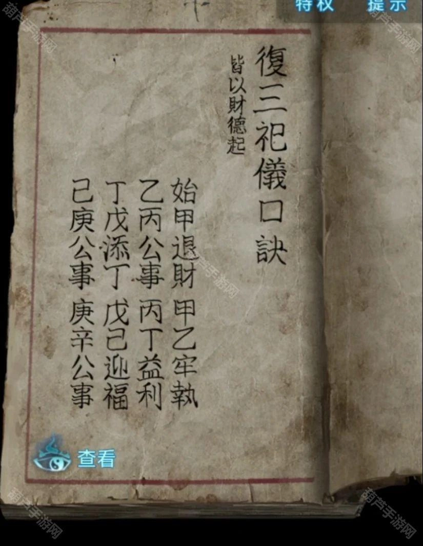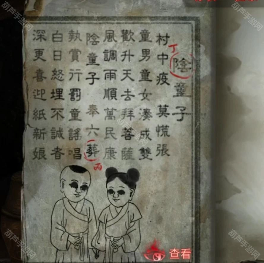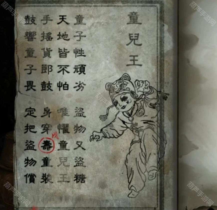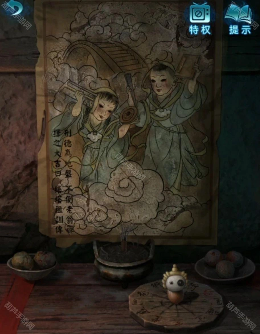 暂时没有什么线索了,回到村口找婆婆,给婆婆看圆盘得知这就是刑德,等婆婆补好了就获得了刑德盘,再次回到密室,在后面挂画的桌子上使用刑德盘,然后依次使用鸡蛋壳、胶水、碎石子、六葬娃娃头做成不倒翁后,后面画里的孩子就把手里的书扔下来了。