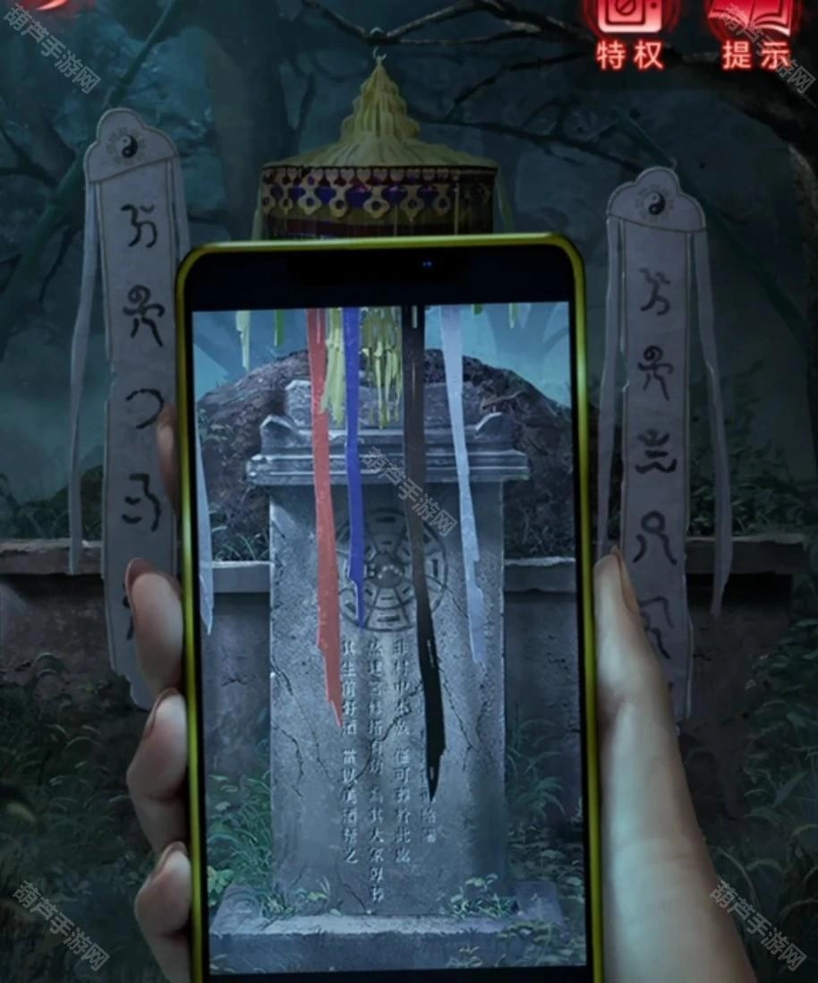 祭坛这儿先看看石碑,上面提示小祭只需吹奏曲子,大祭则要祭祀者身着祭服摇旗,还要供奉蜡烛,另外得在墓地摇旗——要求确实不少。那我们先从吹曲开始吧:把显示小喇叭的手机放进石碑上的空缺处,小喇叭会变成吹奏的画面;接着查看左边的棺材,用石刀砍断绳子就能拿到唢呐,对石碑上的画面使用唢呐就能触发小游戏。玩这个游戏时,按照石碑上亮起的字按下对应的按钮即可,注意要按住按钮直到下一个字亮起,不是点一下就松开哦!吹完曲子后,再去看左边的石棺,就能拿到祭服了。ps. 听说大家都很喜欢玩《纸嫁衣》里的乐器,这次唢呐解谜后不会消失,留给大家玩! 之后回到口舌所在的位置,把祭服烧给口舌,再把福字旗也烧过去。剧情结束后,口舌旁边的白色小蜡烛会亮起生命之火,拿到这团火后直接右转到祭坛。查看中间的供桌,将蜡烛放在右侧,左侧的蜡烛就会自动点燃。此时中间的镜子会有小高能,左下角箱子上的照片也会变成女主的,接着触发小游戏:这个游戏的规则是看头像朝向哪边,就点哪边对应的字,而选第几个字则要看下面有几根蜡烛——比如头像朝右且下面有两根蜡烛,就点右边的第二个字。完成游戏后盒子会裂开,从中拿到灵旗。