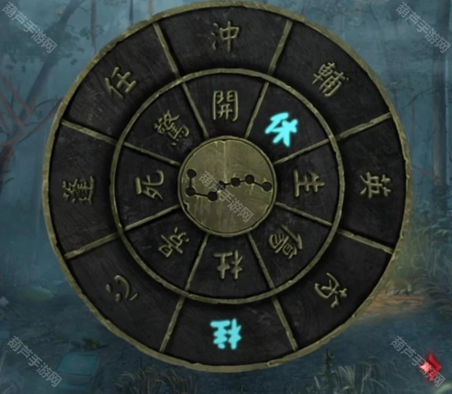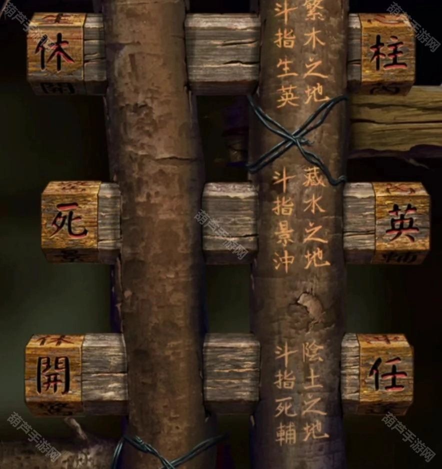 最后一个土,虽然山洞里是有很多土,但是俗话说入土为安,所以墓地才是土所在的方位,在墓地将右边调整为死辅,亮起的字为开任记下来,这样木栅栏的三个线索都齐了,回到山洞里调整木栅栏。