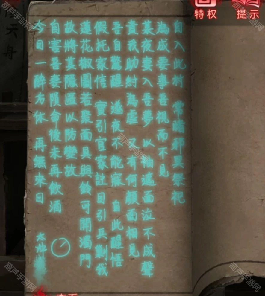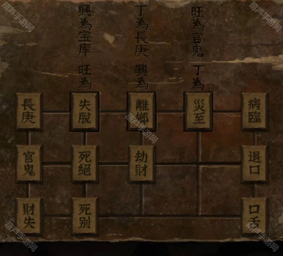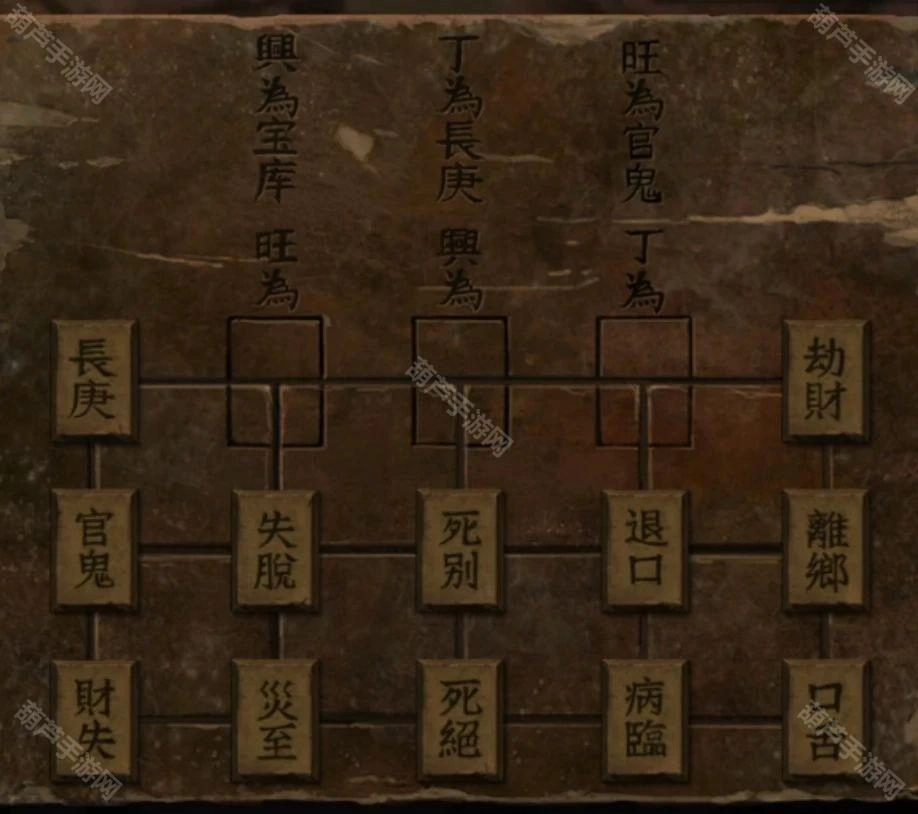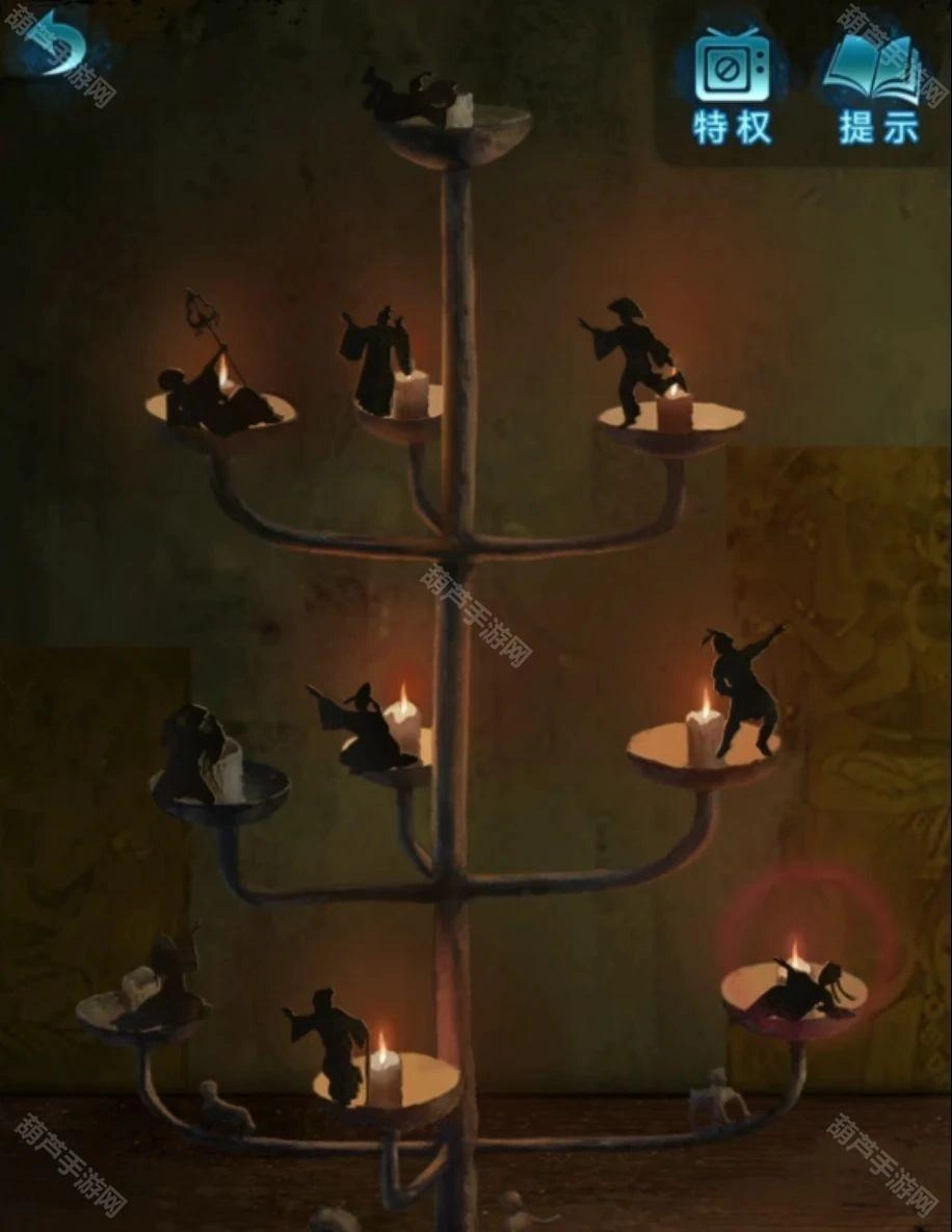 查看一下左边的石壁,把单人旁放在山的旁边组成谷中仙人言卜事,完成后仙人就飞升了,留下一行新的文字,重点就是河魁和戌辰,这肯定又是调整时间的关键了,上楼龙房间先熄灭之前的蜡烛,然后点左上角外圈和右下角内外圈蜡烛让阴影指在河魁和戌辰上,果然来到了新的时间节点,看剧情。