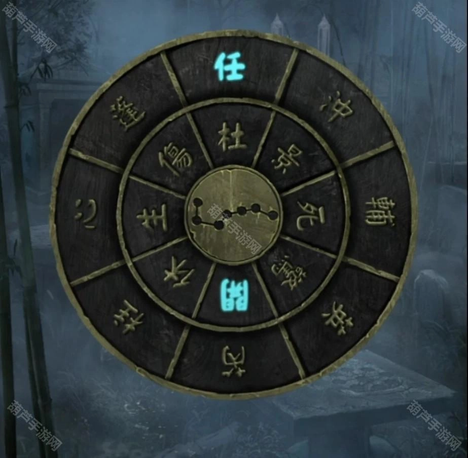 在墓地的右上角坟墓前拿出手机后墓碑出现,手机也变成了个小喇叭造型,查看一下墓碑提示要用美酒祭祀,对墓碑使用美酒后就获得了一个罗盘,看来这就是山洞里门的线索后续了,观察一下罗盘,把中间的北斗七星看做是一个箭头的话右边指的就是我们需要调整的,首先来到木多的地方也就是口舌所在的树林,将生英都调整到右边七星尾巴位置,果然有两个字亮起了,记下来休柱。