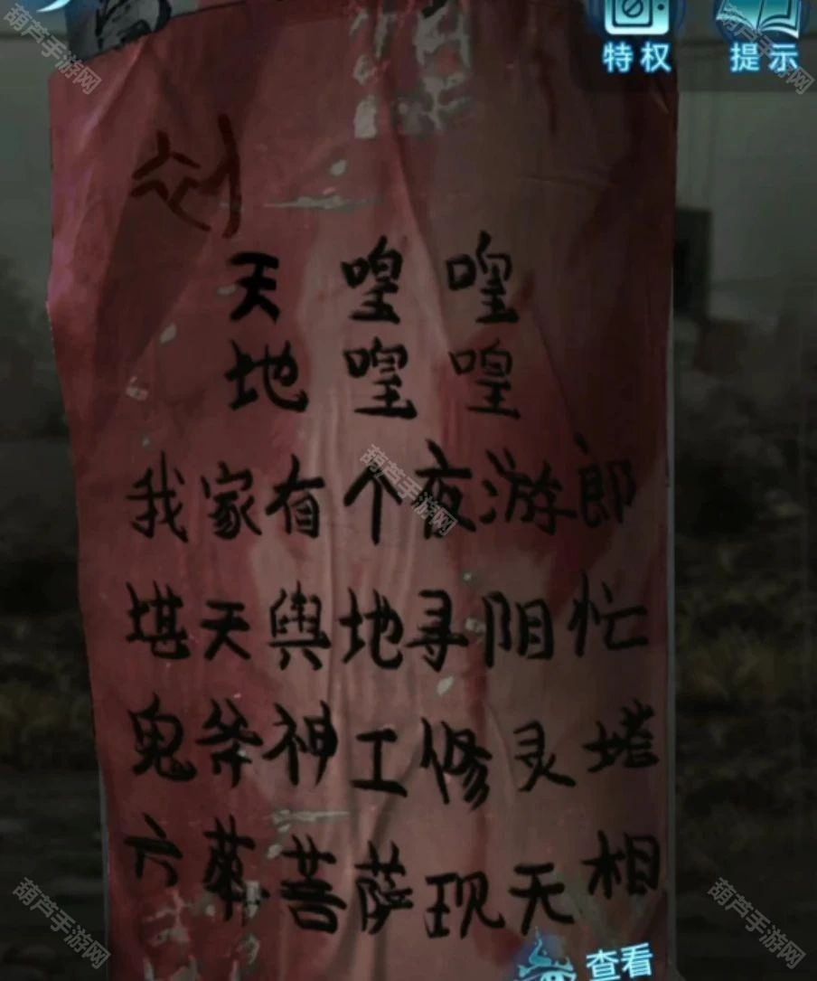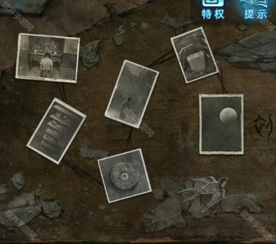 右边的神龛处能拿到秒表,提示还需要金身和哀乐;左边箱子上有台收音机,目前还没找到相关线索,不过收音机旁边可以玩拼图。需要注意的是,得在屋内场景直接点击收音机的左侧,要是点到收音机本身就没法查看了。拼图的顺序对应着外面电线杆上贴的内容,依次是天、地、夜游郎、寻阴、灵塔、菩萨,得从右边标有鬼画符的地方开始:第一个“天”选有风筝和月亮的照片,第二个“地”选墓碑照片,第三个“夜游郎”选小男孩的背影(这张可以用排除法确定),第四个“寻阴”因为需要罗盘所以选罗盘照片,第五个“灵塔”选塔的照片,第六个“菩萨”选小孩子在神龛前跪拜的背影照片。完成拼图后,风筝就会飞出来变成燕子。