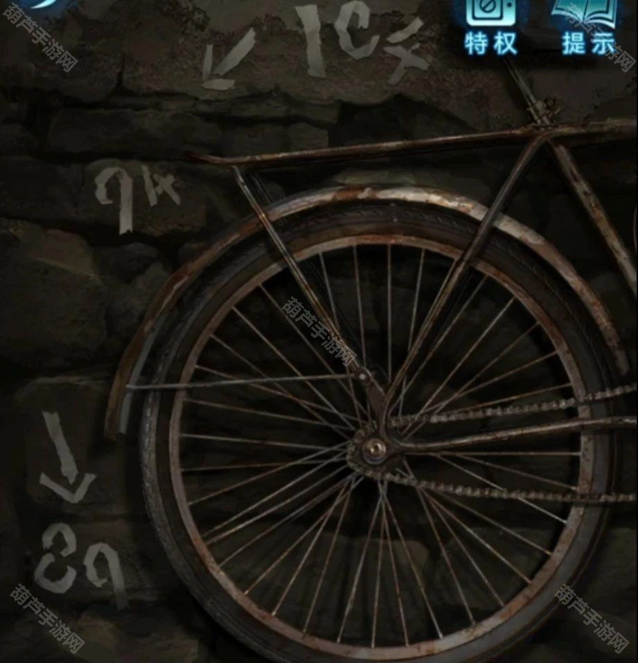 出门先给右边的自行车轮装上车链子,然后上面贴的纸条就甩了出来,按照箭头顺序的话组成了IC-x→94→89,考虑到应该都是数字,所以第一个应该是104,这几个数字结合屋里的收音机就能知道是频道了,顺序是104-94-89。注意车轮下面还有一根铁丝翘了起来,可以拿走,正好就用这个当天线吧。