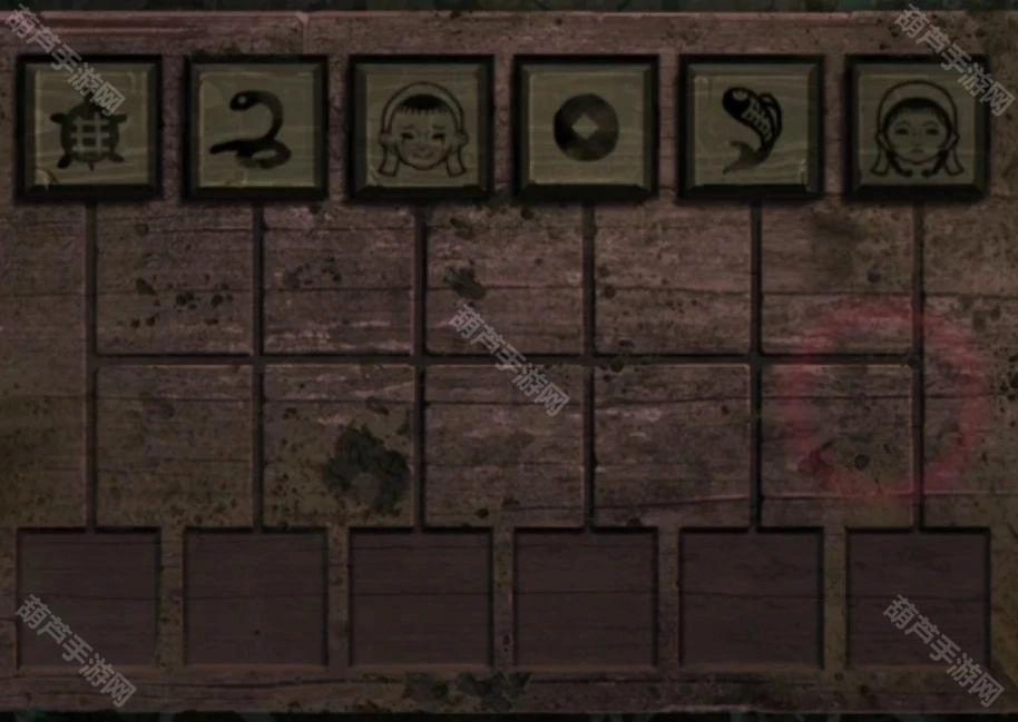 暂时没有其他地方了先离开密室,在屋里查看一下录音机拿走录音带,出门查看右边棚子,剧情后木偶都消失了,后面靠墙拿走铁锹,现在就可以挖了,在婆婆旁边挖一挖拿到一个盒子,注意盒子上面的图案是一闪而过的,需要记住然后调整顺序,米雪的顺序是如下图的,但是不知道这个是不是所有人顺序一样,完成后拿到铁丝枪和有洞的照片。