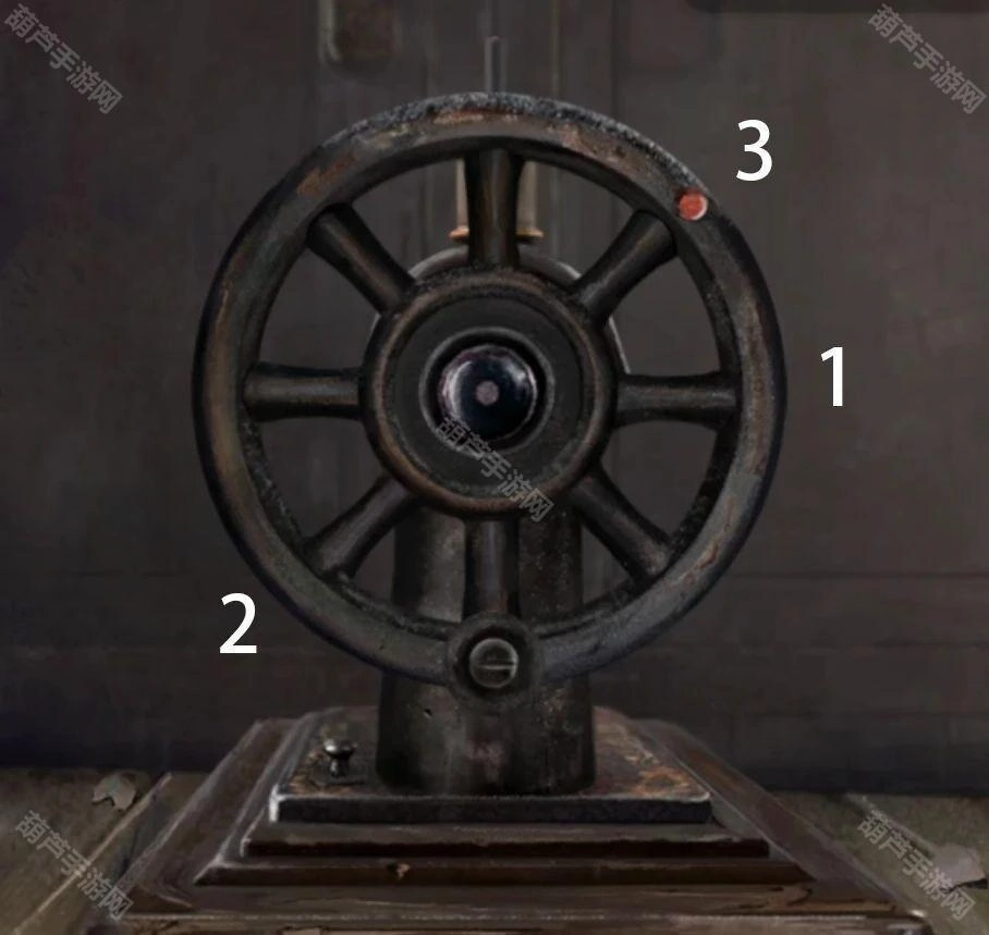 远处的缝纫机查看一下有点眼熟,拿出录音带发现形状和红色位置都很类似,拉一下录音带的左下角发现录音带先旋转到最右边,然后是左下角,最后回到右上角,那么查看一下缝纫机,将轮子的小红点先转到右边,然后转到左下角,最后转回右上角,缝纫机轮子里就掉下来一瓶胶水,这可有点离奇了。