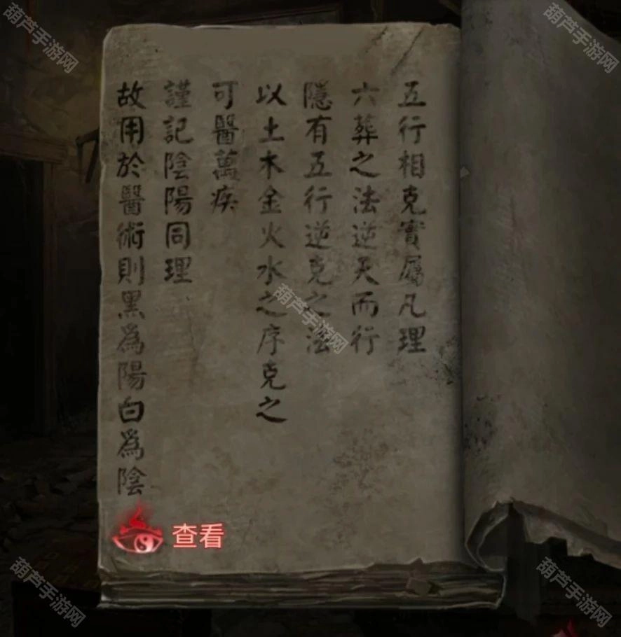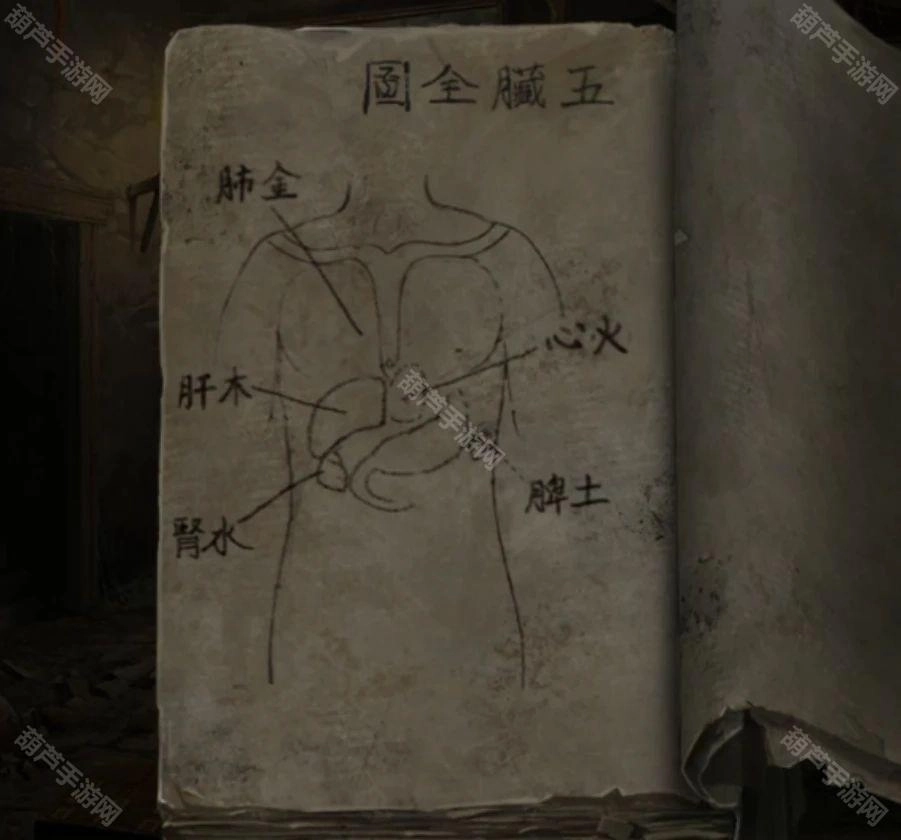 后面的书架上有两本书,线索都比较多,后面用到的时候米雪再截图吧,暂时会用到的是白色书第二页的内容,记下来六葬的五行相克是土木金火水,黑色是阳白色是阴,还有最后一页的五脏属性,金肺、火心、土脾、木肝、水肾,因为我们马上就要玩个看病过家家了。
