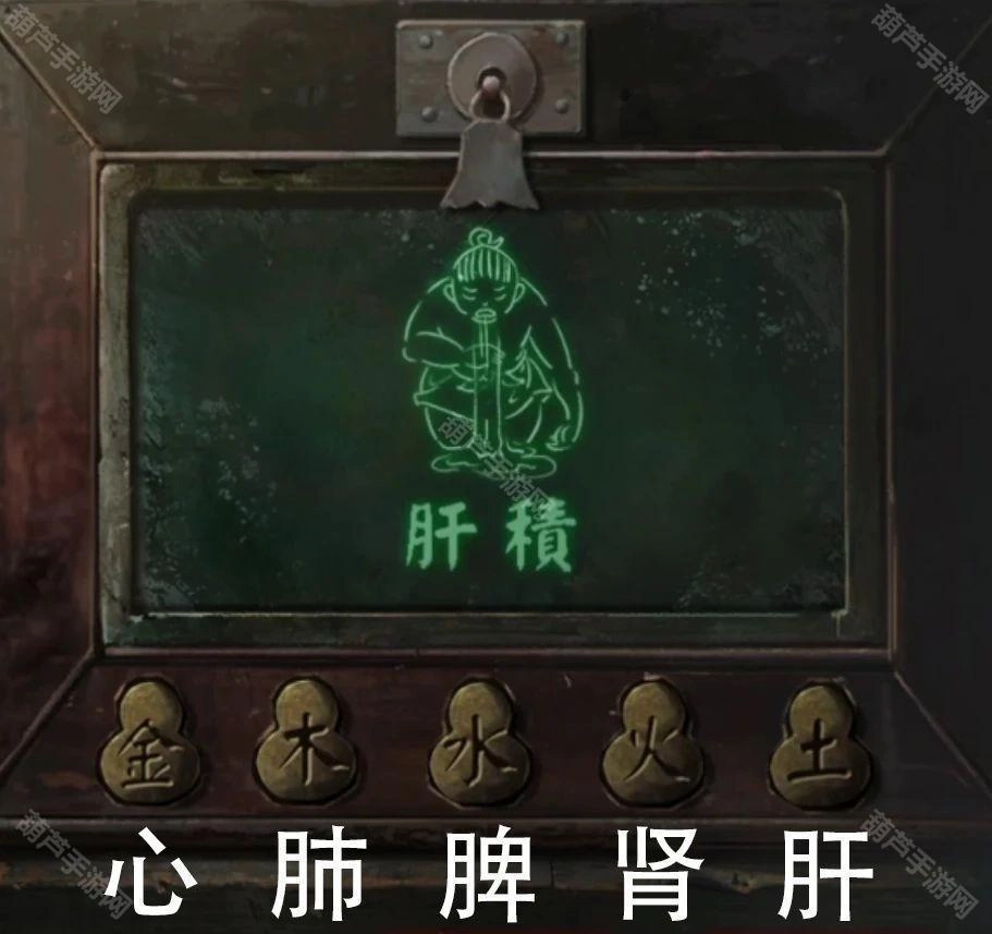 查看一下柜子二层的小木箱就能开始看病了,这里我们先来简化一下游戏,因为要用六葬相克来,也就是下面金木水火土能克制的属性是火金土水木,再带入金肺、火心、土脾、木肝、水肾,就能得出下面能治疗的部位分别是心、肺、脾、肾、肝,看上面屏幕出现哪个点哪个就行了~不用担心时间限制的,不要着急慢慢点,完成后打开盒子,左边拿到小锤子,右边拿到三根黑针。