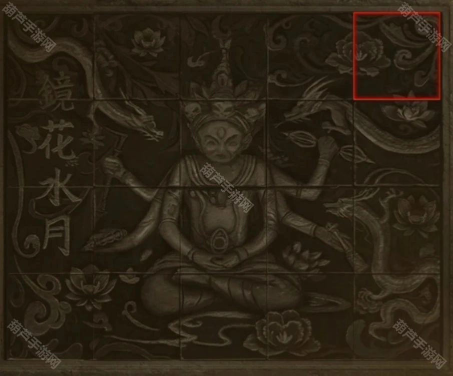 再去密室里看一眼,点燃中间的蜡烛发现也变样子了,左边的石壁上出现了一行有空缺的字,读一下就猜到缺个单人旁,应该是谷中仙人言卜事,右边的石壁放上小方块玩一个拼图,我们首先调整一下位置拼出来普通版本拼图,能看到左边有镜花水月几个字,考虑到下面有垂直和水平翻转,那么这个不是要垂直镜像就是要水平镜像了。